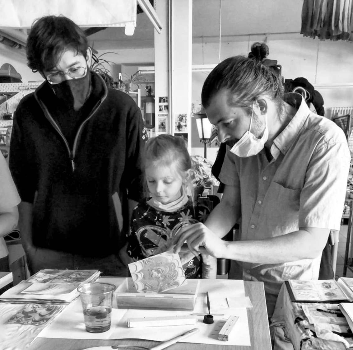 un atelier permettant une pratique simple et décomplexée du suminagashi, l’art des papiers marbrés japonais, qui se pratique avec de l’encre de Chine à la surface de l’eau.